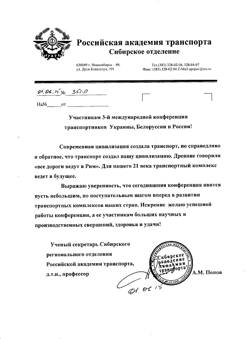 Позвольте от себя лично, а также ученых Уральского межрегионального Отделения Российской Академии транспорта, ученых Уральского государственного университета путей сообщения пожелать успешной работы форуму, который должен способствовать решению нестандартных и сложных задач совершенствования транспорта.