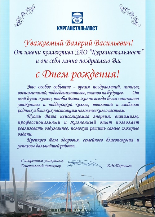 Поздравление с Днем рождения доктору транспорта, генеральному директору ООО "Мостпроект" Моисееву Олегу Юрьевичу