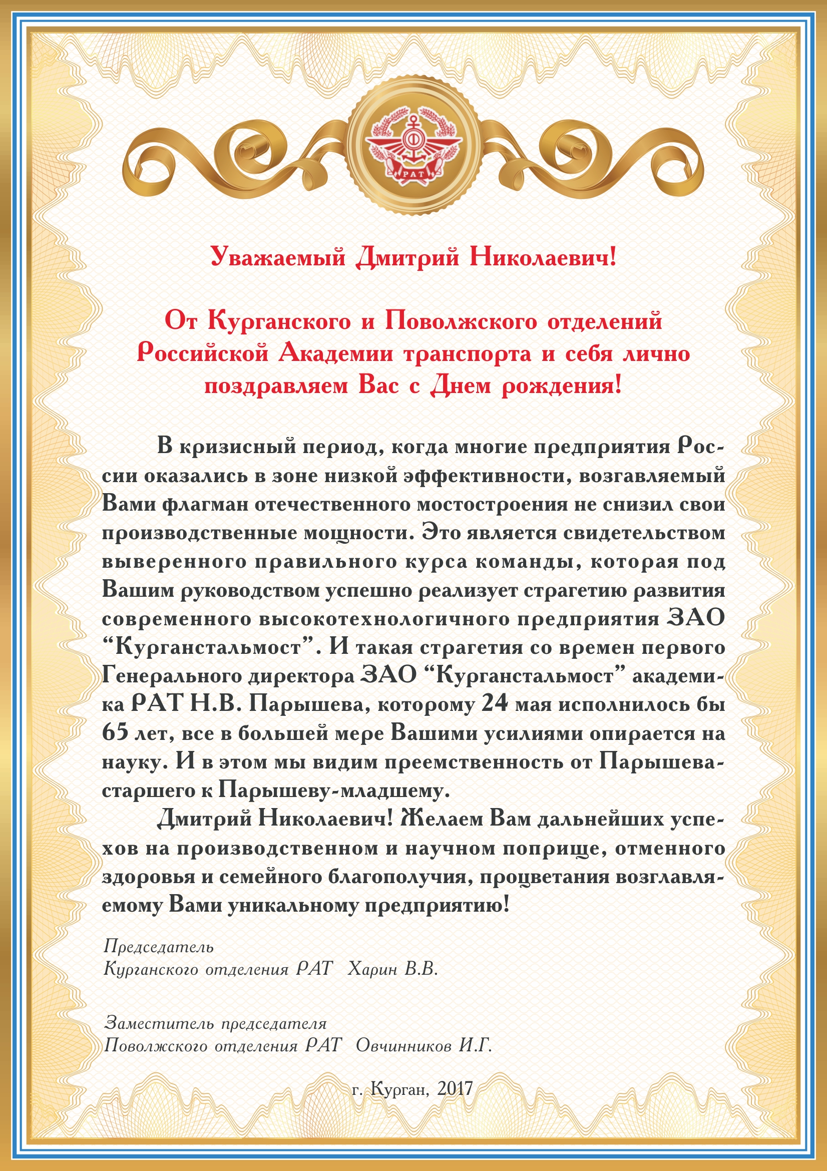 От Поволжского и Курганского Отделений РАТ и лично от академиков РАТ Овчинникова И.Г., Кочеткова А.В. и Харина В.В. поздравление по случаю 45-летия Доктору транспорта, действительному члену РАТ, Генеральному директору ООО «Мостпроект», заместителю технического директора ЗАО Курганстальмост Моисееву О.Ю.
